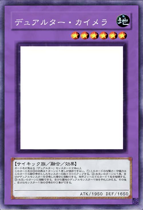| カード名が異なる「デュアルター」モンスター×2体以上 このカード名の③の効果は1ターンに1度しか使用できない。①:このカードの攻撃力・守備力はこのカードの融合素材としたモンスターの数×300アップする。②:お互いのターンに1度、自分がデュアルモンスターを召喚した場合に発動できる。相手フィールドのカード1枚を破壊する。③:お互いのターンに発動できる。自分の墓地のデュアルモンスター1体を手札に加える。その後、自分はモンスター1体の召喚を行う事ができる。 | |||