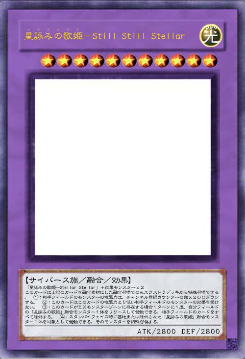 | 「星詠みの歌姫-Stellar Stellar」+効果モンスターx2 このカードは上記のカードを融合素材にした融合召喚でのみエクストラデッキから特殊召喚できる。 ①:相手フィールドのモンスターの攻撃力は、チャンネル登録カウンターの数x200ダウンする。 ②:このカードはこのカードの攻撃力より低い相手フィールドのモンスターの効果を受けない。 ③:このカードがEXモンスターゾーンに存在する場合1ターンに1度、自分フィールドの「星詠みの歌姫」融合モンスター1体をリリースして発動できる。相手フィールドのカードをすべて除外する。 ④:スタンバイフェイズ時に墓地または除外された「星詠みの歌姫」融合モンスター1体を対象として発動できる。そのモンスターを特殊召喚する。 | |||