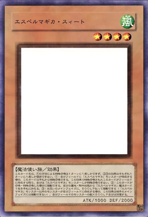 ※前のコメントでメイクアップが初動と言いましたが、メイクアップ初動だと魔法少女が最大で3人しか並びませんでした…なので、前に投稿したメイクアップの効果を少し変えておきます。恐らく2枚サーチ手札1コストみたいな感じにする予定。制約も「エスペルマギカ」しか出せないようにします。」(2024-04-09 07:44)