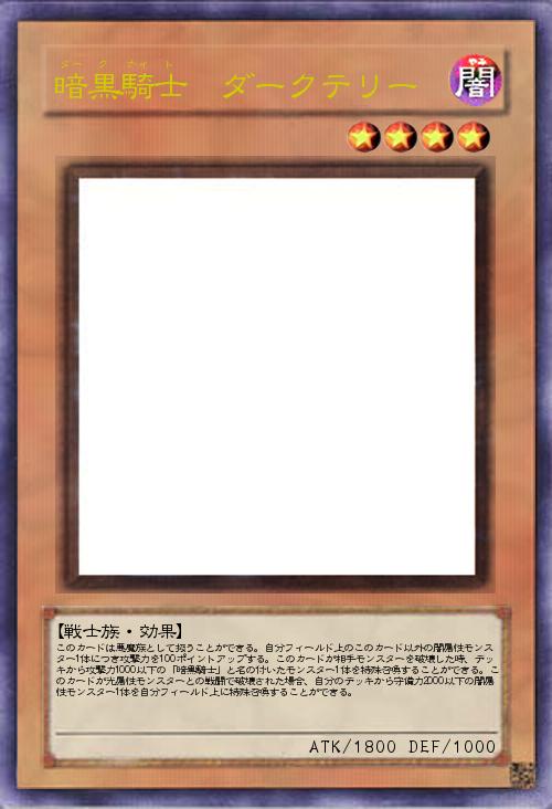| このカードは悪魔族として扱うことができる。自分フィールド上のこのカード以外の闇属性モンスター1体につき攻撃力を100ポイントアップする。このカードが相手モンスターを破壊した時、デッキから攻撃力1000以下の「暗黒騎士」と名の付いたモンスター1体を特殊召喚することができる。このカードが光属性モンスターとの戦闘で破壊された場合、自分のデッキから守備力2000以下の闇属性モンスター1体を自分フィールド上に特殊召喚することができる。 | |||