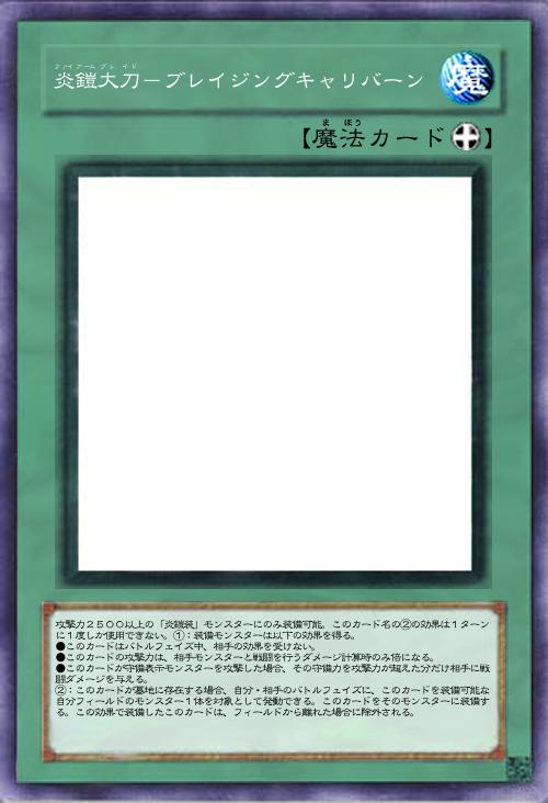 | 攻撃力2500以上の「炎鎧装」モンスターにのみ装備可能。このカード名の②の効果は1ターンに1度しか使用できない。①:装備モンスターは以下の効果を得る。 ●このカードはバトルフェイズ中、相手の効果を受けない。 ●このカードの攻撃力は、相手モンスターと戦闘を行うダメージ計算時のみ倍になる。 ●このカードが守備表示モンスターを攻撃した場合、その守備力を攻撃力が超えた分だけ相手に戦闘ダメージを与える。 ②:このカードが墓地に存在する場合、自分・相手のバトルフェイズに、このカードを装備可能な自分フィールドのモンスター1体を対象として発動できる。このカードをそのモンスターに装備する。この効果で装備したこのカードは、フィールドから離れた場合に除外される。 | |||