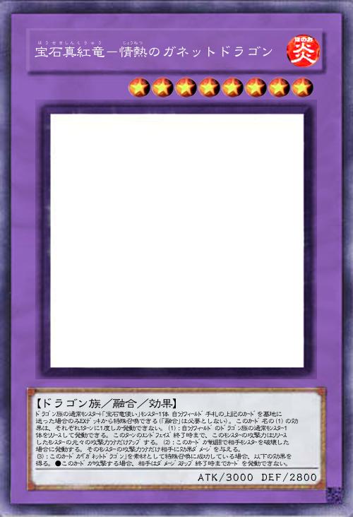 | ドラゴン族の通常モンスター+「宝石竜使い」モンスター1体 自分フィールド手札の上記のカードを墓地に送った場合のみEXデッキから特殊召喚できる(「融合」は必要としない)。このカード名の(1)の効果は、それぞれ1ターンに1度しか発動できない。(1):自分フィールドのドラゴン族の通常モンスター1体をリリースして発動できる。このターンのエンドフェイズ終了時まで、このモンスターの攻撃力はリリースしたモンスターの元々の攻撃力分だけアップする。(2):このカードが戦闘で相手モンスターを破壊した場合に発動する。そのモンスターの攻撃力分だけ相手に効果ダメージを与える。 (3):このカードが「ガネットドラゴン」を素材として特殊召喚に成功している場合、以下の効果を得る。●このカードが攻撃する場合、相手はダメージステップ終了時までカードを発動できない。 | |||