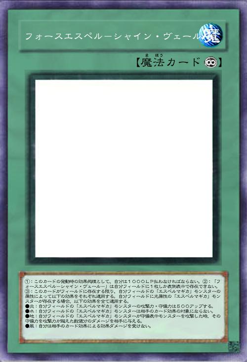 | ①:このカードの発動時の効果処理として、自分は1000LP払わなければならない。②:「フォースエスペル-シャイン・ヴェール-」は自分フィールドに1枚しか表側表示で存在できない。③:このカードがフィールドに存在する限り、自分フィールドの「エスペルマギカ」モンスターの属性によって以下の効果をそれぞれ適用する。自分フィールドに光属性の「エスペルマギカ」モンスターが存在する場合、以下の効果を全て適用する。 ●炎:自分フィールドの「エスペルマギカ」モンスターの攻撃力・守備力は500アップする。 ●水:自分フィールドの「エスペルマギカ」モンスターは相手のカード効果の対象にならない。 ●地:自分フィールドの「エスペルマギカ」モンスターが守備表示モンスターを攻撃した時、その守備力を攻撃力が超えた数値分のダメージを相手に与える。 ●風:自分は相手のカード効果による効果ダメージを受けない。 | |||