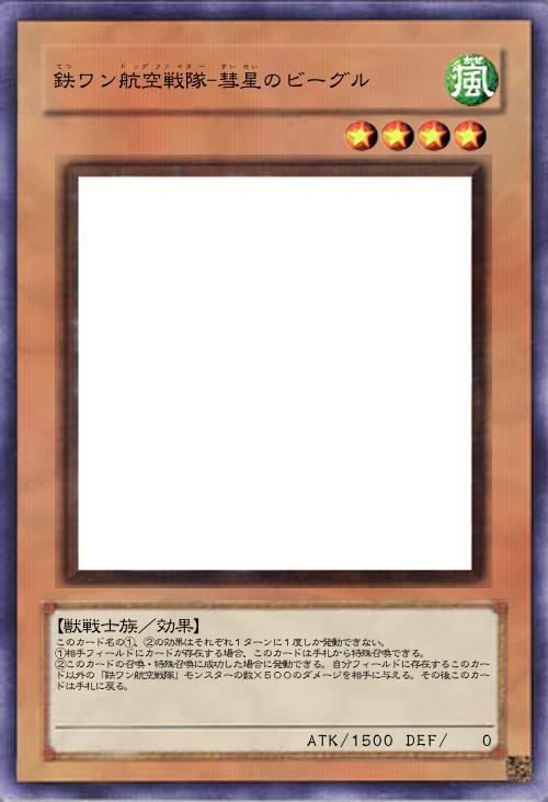 | このカード名の①、②の効果はそれぞれ1ターンに1度しか発動できない。 ①相手フィールドにカードが存在する場合、このカードは手札から特殊召喚できる。 ②このカードの召喚・特殊召喚に成功した場合に発動できる。自分フィールドに存在するこのカード以外の「鉄ワン航空戦隊」モンスターの数×500のダメージを相手に与える。その後このカードは手札に戻る。 | |||
