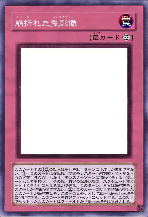 | このカード名の①②の効果はそれぞれ1ターンに1度しか使用できない。①:このカードは発動後、効果モンスター(岩石族・闇・星2・攻0/守1600)となり、モンスターゾーンに特殊召喚する(罠カードとしても扱う)。その後、自分の除外状態の「スタチュー」罠カード1枚を手札に加える事ができる。このターン、自分は岩石族モンスターしか特殊召喚できない。②:このカードの効果で特殊召喚したこのカードが岩石族LモンスターのL素材として墓地へ送られた場合に発動できる。このカードを自分フィールドにセットする。この効果でセットしたこのカードはフィールドから離れた場合に除外される。 | |||