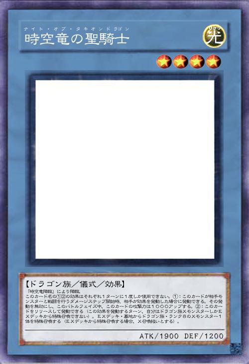 | 「時空竜降臨」により降臨。 このカード名の①②の効果はそれぞれ1ターンに1度しか使用できない。①:このカードが相手モンスターと戦闘を行うダメージステップ開始時、相手が効果を発動した場合に発動できる。その発動を無効にし、このバトルフェイズ中、このカードの攻撃力は1000アップする。②:このカードをリリースして発動できる(この効果を発動するターン、自分はドラゴン族XモンスターしかEXデッキから特殊召喚できない)。EXデッキ・墓地からドラゴン族・ランク8のXモンスター1体を特殊召喚する(EXデッキから特殊召喚する場合、X召喚扱いとする)。 | |||