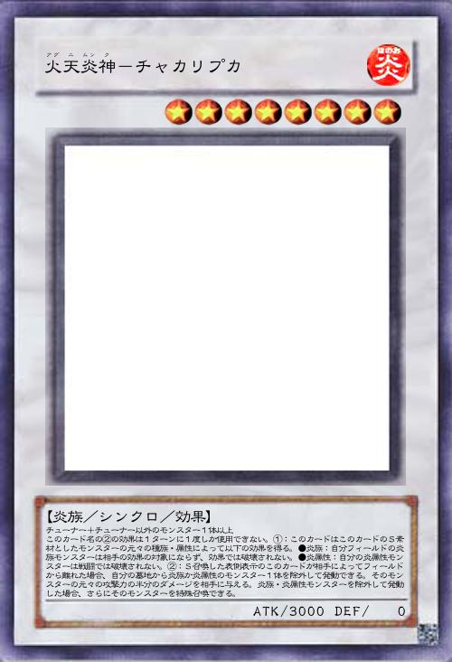 | チューナー+チューナー以外のモンスター1体以上 このカード名の②の効果は1ターンに1度しか使用できない。①:このカードはこのカードのS素材としたモンスターの元々の種族・属性によって以下の効果を得る。●炎族:自分フィールドの炎族モンスターは相手の効果では破壊されず、相手はそれらを効果の対象にできない。●炎属性:自分の炎属性モンスターは戦闘では破壊されない。②:S召喚した表側表示のこのカードが相手によってフィールドから離れた場合、自分の墓地から炎族か炎属性のモンスター1体を除外して発動できる。そのモンスターの元々の攻撃力の半分のダメージを相手に与える。炎族・炎属性モンスターを除外して発動した場合、さらにそのモンスターを特殊召喚できる。 | |||