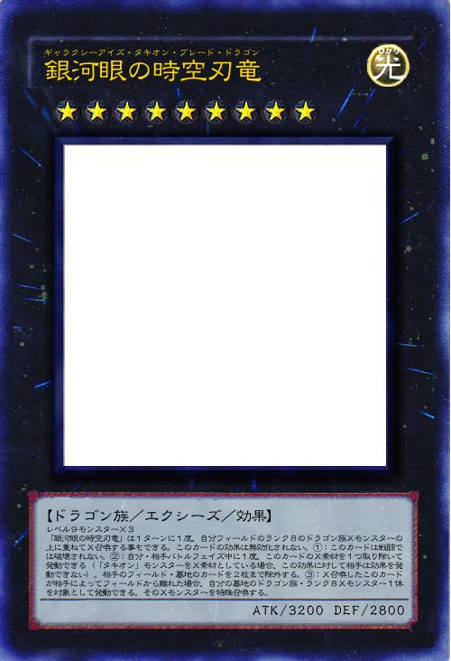 | レベル9モンスター×3 「銀河眼の時空刃竜」は1ターンに1度、自分フィールドのランク8のドラゴン族Xモンスターの上に重ねてX召喚する事もできる。このカードの効果は無効化されない。①:このカードは戦闘では破壊されない。②:自分・相手バトルフェイズ中に1度、このカードのX素材を1つ取り除いて発動できる(「タキオン」モンスターをX素材としている場合、この効果に対して相手は効果を発動できない)。相手のフィールド・墓地のカードを2枚まで除外する。③:X召喚したこのカードが相手によってフィールドから離れた場合、自分の墓地のドラゴン族・ランク8Xモンスター1体を対象として発動できる。そのXモンスターを特殊召喚する。 | |||