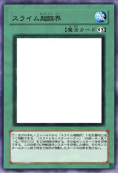 | ①:自分の手札・フィールドから「スライム増殖炉」1枚を墓地に送って発動できる。「スライムモンスタートークン」(水族・水・星1・攻/守500)を2体特殊召喚する。その後モンスター1体を召喚できる。この効果で幻神獣族モンスターを召喚した場合、そのモンスターはターン終了時まで相手が発動したカードの効果を受けない。 | |||