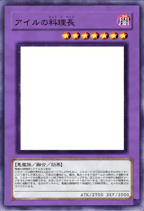 | 悪魔の調理師+アイルの小剣士 このカードの融合素材は上記のカードでしか行えない。このカードの①②の効果はそれぞれ1ターンに1度でしか使えない。①自分の墓地から、魔法、罠カードを1枚ゲームから除外して発動できる。このカードの攻撃力はターン終了時まで700アップする。②このカードが相手に戦闘ダメージを与えた時に発動できる。お互いはデッキからカード1枚ドローする。③このカードが破壊された時に発動できる。自分のデッキから、悪魔の調理師を1体選択して特殊召喚し、元々の攻撃力は3000になる。 | |||