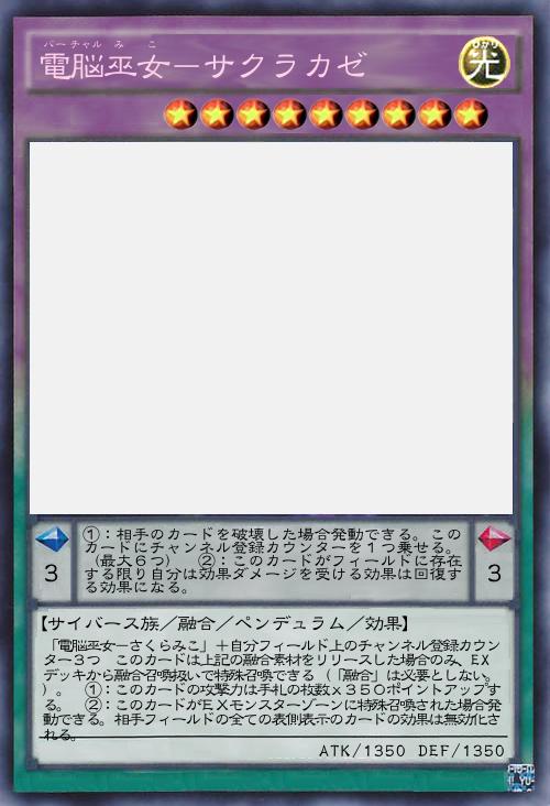 | 「電脳巫女-さくらみこ」+自分フィールド上のチャンネル登録カウンター3つ このカードは上記の融合素材をリリースした場合のみ、EXデッキから融合召喚扱いで特殊召喚できる(「融合」は必要としない。)。 ①:このカードの攻撃力は手札の枚数x350ポイントアップする。 ②:このカードがEXモンスターゾーンに特殊召喚された場合発動できる。相手フィールドの全ての表側表示のカードの効果は無効化される。 | |||
