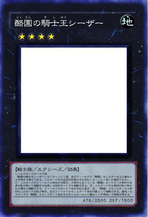 | レベル4モンスター×2体 「酪園の騎士王シーザー」は1ターンに1度、自分フィールドの「酪園」モンスターの上に重ねてX召喚する事もできる。このカード名の②③の効果はそれぞれ1ターンに1度しか使用できない。 ①:このカードがフィールドに存在する限り、X素材となっている「酪園」カードの「X素材の自身を取り除いて発動する効果」は相手ターンでも発動できる。②:このカードのX素材が取り除かれた場合に発動できる。フィールドのカード1枚を手札に戻す。③:「酪園」XモンスターのX素材のこのカードを取り除き、自分フィールドのモンスター1体を対象として発動できる。墓地・EXデッキの「酪園」Xモンスター1体をそのモンスターの上に重ねてX召喚扱いで特殊召喚する。 | |||