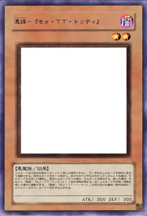 | このカード名の②の効果は1ターンに1度しか使用できない。①:手札のこのカードを相手に見せて発動できる。相手はカード名を1つ宣言し、自分の全ての手札の中からランダムに1枚選ぶ。そのカードをお互いに確認し、宣言したカードだった場合、そのカードを除外する。違った場合、手札から「悪諱-『モォ・TT・トッティ』」1体を特殊召喚する。②:このカードが召喚・特殊召喚した場合に発動できる。「悪諱-『モォ・TT・トッティ』」以外の自分の墓地・除外状態の「ワイルド・ガスト」カード1枚を手札に加える。 | |||