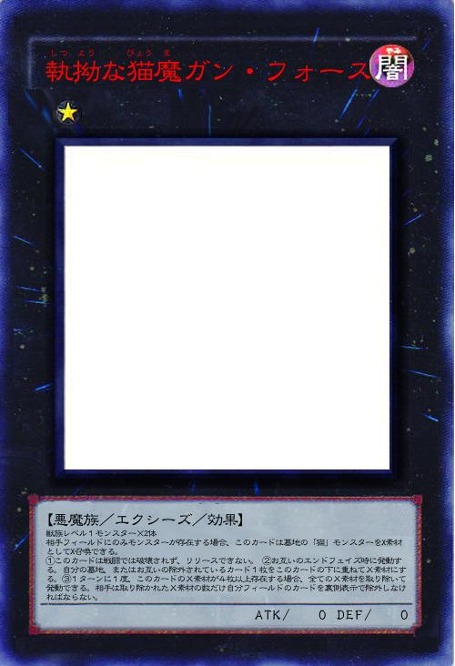 | 獣族レベル1モンスター×2体 相手フィールドにのみモンスターが存在する場合、このカードは墓地の「猫」モンスターをX素材としてX召喚できる。 ①このカードは戦闘では破壊されず、リリースできない。 ②お互いのエンドフェイズ時に発動する。自分の墓地、またはお互いの除外されているカード1枚をこのカードの下に重ねてX素材にする。③1ターンに1度、このカードのX素材が4枚以上存在する場合、全てのX素材を取り除いて発動できる。相手は取り除かれたX素材の数だけ自分フィールドのカードを裏側表示で除外しなければならない。 | |||