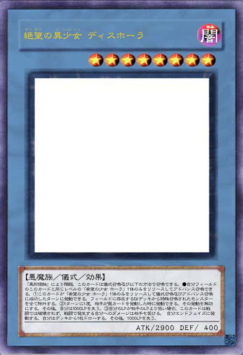 | 「異形侵蝕」により降臨。このカードは儀式召喚及び以下の方法で召喚できる。●自分フィールドのこのカードと同じレベルの「希望の少女 ホーラ」1体のみをリリースしてアドバンス召喚できる。①このカードが「希望の少女 ホーラ」1体のみをリリースして儀式召喚及びアドバンス召喚に成功したターンに発動できる。フィールドに存在するEXデッキから特殊召喚されたモンスターを全て除外する。②1ターンに1度、相手が罠カードを発動した時に発動できる。その発動を無効にする。その後、自分は1000LPを失う。③自分のLPが相手のLPより低い場合、このカードは戦闘では破壊されず、戦闘で発生する自分へのダメージは相手も受ける。➃自分エンドフェイズに発動する。自分はデッキから1枚ドローする。その後、1000LPを失う。 | |||