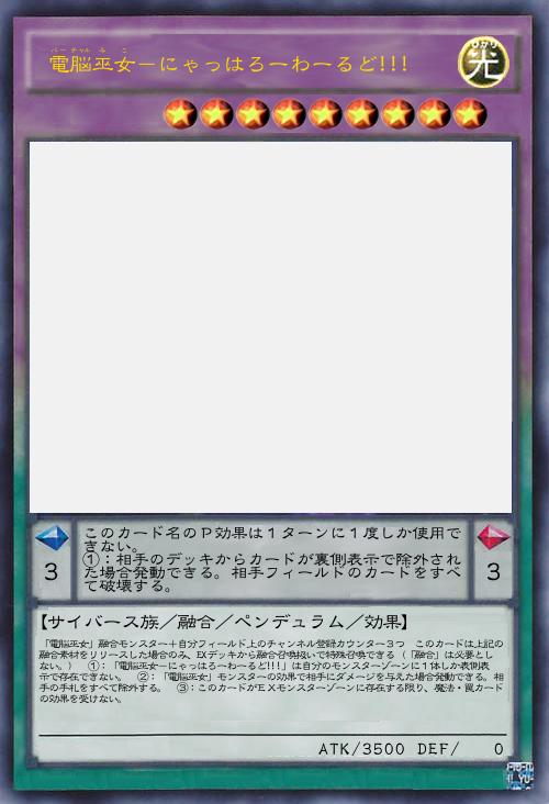 | 「電脳巫女」融合モンスター+自分フィールド上のチャンネル登録カウンター3つ このカードは上記の融合素材をリリースした場合のみ、EXデッキから融合召喚扱いで特殊召喚できる(「融合」は必要としない。) ①:「電脳巫女-にゃっはろーわーるど!!!」は自分のモンスターゾーンに1体しか表側表示で存在できない。 ②:「電脳巫女」モンスターの効果で相手にダメージを与えた場合発動できる。相手の手札をすべて除外する。 ③:このカードがEXモンスターゾーンに存在する限り、魔法・罠カードの効果を受けない。 | |||