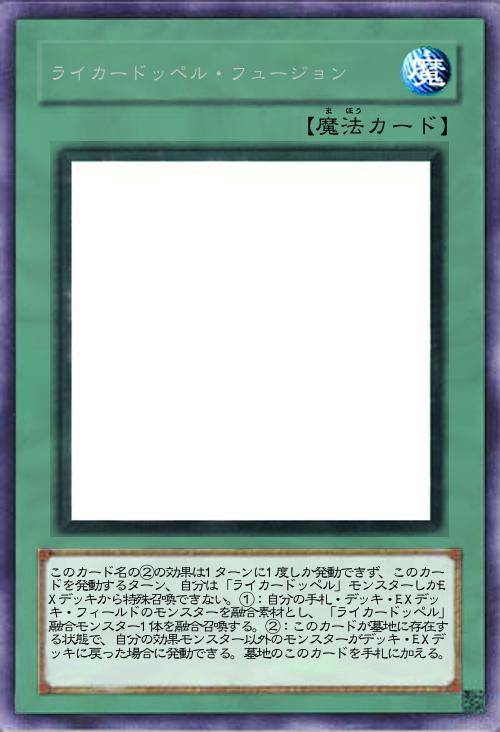 | このカード名の②の効果は1ターンに1度しか発動できず、このカードを発動するターン、自分は「ライカードッペル」モンスターしかEXデッキから特殊召喚できない。①:自分の手札・デッキ・EXデッキ・フィールドのモンスターを融合素材とし、「ライカードッペル」融合モンスター1体を融合召喚する。②:このカードが墓地に存在する状態で、自分の効果モンスター以外のモンスターがデッキ・EXデッキに戻った場合に発動できる。墓地のこのカードを手札に加える。 | |||