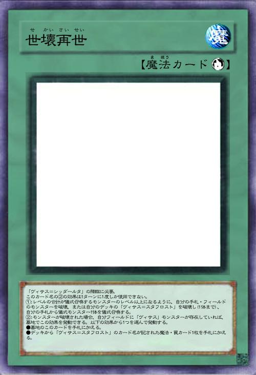 「「ヴィサス=シッダールタ」を儀式召喚するための儀式魔法です。高等儀式術とヘヴィ・トリガーを足して2倍したような超性能を持っています。①で「ヴィサス=シッダールタ」を出すことができれば、②の効果も儀式召喚成功時に発動できます。儀式の下準備でこのカードとシッダールタを持ってくれば、召喚権を使用せず誘発妨害モンスターのケアと世壊関連テーマの初動をサーチするとんでも展開が出来てしまいます。(既にこのサイト内にカード名の構成がほぼ同じ先駆者様のカードがありますが無関係です)」(2024-04-20 23:19)