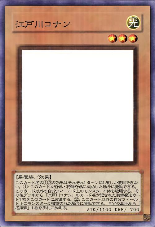 | このカード名の①②の効果はそれぞれ1ターンに1度しか使用できない。①:このカードが召喚・特殊召喚に成功した場合に発動できる。このカード以外の自分フィールド上のモンスター1体を破壊する。その後デッキから「江戸川コナン」のカード名が記された装備魔法カード1枚をこのカードに装備する。②:このカード以外の自分フィールド上のモンスターが破壊された場合に発動できる。自分の墓地から「名推理」1枚を手札に加える。 | |||