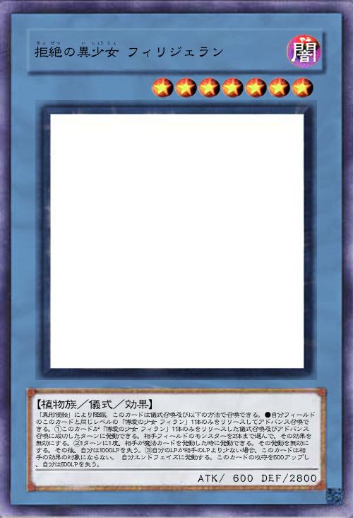 | 「異形侵蝕」により降臨。このカードは儀式召喚及び以下の方法で召喚できる。●自分フィールドのこのカードと同じレベルの「博愛の少女 フィラン」1体のみをリリースしてアドバンス召喚できる。①このカードが「博愛の少女 フィラン」1体のみをリリースした儀式召喚及びアドバンス召喚に成功したターンに発動できる。相手フィールドのモンスターを2体まで選んで、その効果を無効にする。②1ターンに1度、相手が魔法カードを発動した時に発動できる。その発動を無効にする。その後、自分は1000LPを失う。③自分のLPが相手のLPより少ない場合、このカードは相手の効果の対象にならない。➃自分エンドフェイズに発動する。このカードの攻守を500アップし、自分は500LPを失う。 | |||