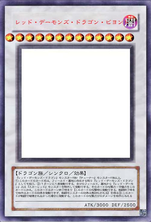| 『レッド・デーモンズ・ドラゴン』モンスター1体+『チューナー』モンスター1体以上。 ①:このカードのカード名は、フィールド・墓地に存在する限り『レッド・デーモンズ・ドラゴン』としても扱う。②:1ターンに1度発動できる。自分のフィールド、墓地から『レッド・デーモン』又は『スカーレッド』モンスターを除外して発動できる。そのカードの攻撃力・守備力をこのカードに加え、このカードはターン終了時まで【このカードの攻撃時に発動できる。戦闘終了時まで相手はカードの効果を発動できず、戦闘モンスターの効果は無効化される】を得る③:このカードが戦闘で破壊されなかった場合に発動する。このカードの攻撃力分のダメージを相手に与える | |||