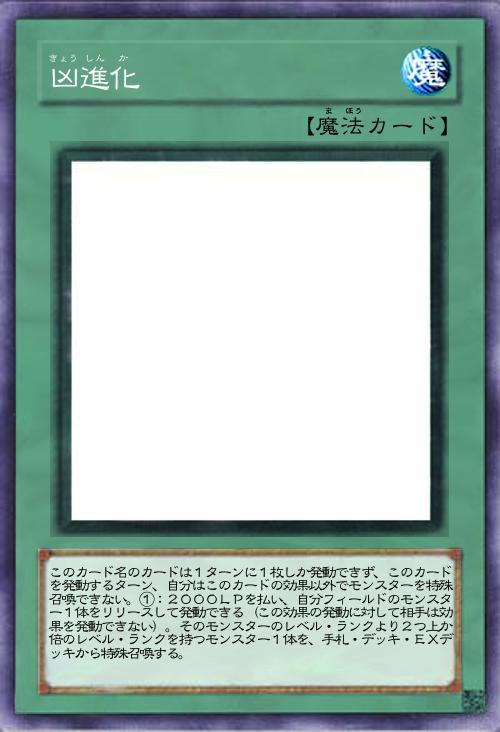| このカード名のカードは1ターンに1枚しか発動できず、このカードを発動するターン、自分はこのカードの効果以外でモンスターを特殊召喚できない。①:2000LPを払い、自分フィールドのモンスター1体をリリースして発動できる(この効果の発動に対して相手は効果を発動できない)。そのモンスターのレベル・ランクより2つ上か倍のレベル・ランクを持つモンスター1体を、手札・デッキ・EXデッキから特殊召喚する。 | |||