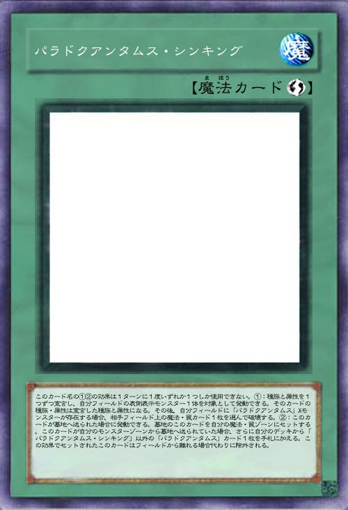 | このカード名の①②の効果は1ターンに1度いずれか1つしか使用できない。①:種族と属性を1つずつ宣言し、自分フィールドの表側表示モンスター1体を対象として発動できる。そのカードの種族・属性は宣言した種族と属性になる。その後、自分フィールドに「パラドクアンタムス」Xモンスターが存在する場合、相手フィールド上の魔法・罠カード1枚を選んで破壊する。②:このカードが墓地へ送られた場合に発動できる。墓地のこのカードを自分の魔法・罠ゾーンにセットする。このカードが自分のモンスターゾーンから墓地へ送られていた場合、さらに自分のデッキから「パラドクアンタムス・シンキング」以外の「パラドクアンタムス」カード1枚を手札に加える。この効果でセットされたこのカードはフィールドから離れる場合代わりに除外される。 | |||