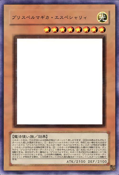 | このカード名の、①の方法による特殊召喚は1ターンに1度しかできず、②③の効果はそれぞれ1ターンに1度しか使用できない。①:自分フィールドのモンスターが、存在しない場合または自分フィールドに「プリスペルマギカ」モンスター及び「エスペルマギカ」モンスターが存在する場合、このカードは手札から特殊召喚できる。②:このカードが特殊召喚した場合に発動できる。デッキから「プリスペルマギカ・ディストリィ」1体を手札に加える。③:お互いのメインフェイズに発動できる。自分のデッキ・墓地から「プリスペルマギカ」のカード名が記された魔法カード1枚を自分フィールドにセットする。この効果の発動時、自分フィールドに「プリスペルマギカ・ディストリィ」が存在する場合、この効果でセットされた速攻魔法カードはセットしたターンに発動できる。 | |||