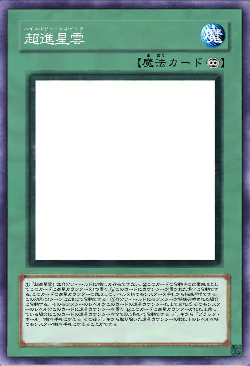 | ①「超進星雲」は自分フィールドに1枚しか存在できない。②このカードの発動時の効果処理としてこのカードに進星カウンターを1つ置く。③このカードにカウンターが置かれた場合に発動できる。このカードの進星カウンターの数以上のレベルを持つモンスターを手札から特殊召喚できる。この効果は1ターンに2度まで発動できる。④自分フィールドにモンスターが特殊召喚された場合に発動する。そのモンスターのレベルがこのカードの進星カウンター以上であれば、そのモンスターのレベル分このカードに進星カウンターを置く。⑤このカードに進星カウンターが10以上乗っている場合にこのカードの進星カウンターを全て取り除いて発動できる。デッキから「ブラック・ホール」1枚を手札に加える。その後デッキから取り除いた進星カウンターの数以下のレベルを持つモンスター1枚を手札に加えることができる。 | |||