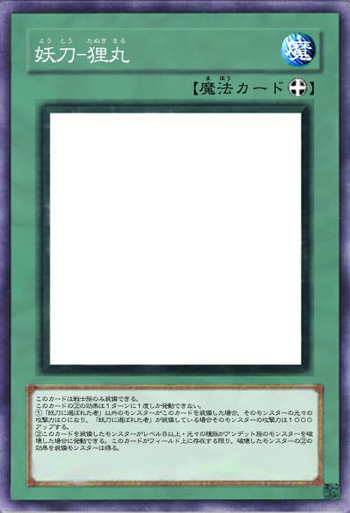 | このカードは戦士族のみ装備できる。 このカードの②の効果は1ターンに1度しか発動できない。 ①「妖刀に選ばれた者」以外のモンスターがこのカードを装備した場合、そのモンスターの元々の攻撃力は0になり、「妖刀に選ばれた者」が装備している場合そのモンスターの攻撃力は1000アップする。 ②このカードを装備したモンスターがレベル8以上・元々の種族がアンデット族のモンスターを破壊した場合に発動できる。このカードがフィールド上に存在する限り、破壊したモンスターの②の効果を装備モンスターは得る。 | |||