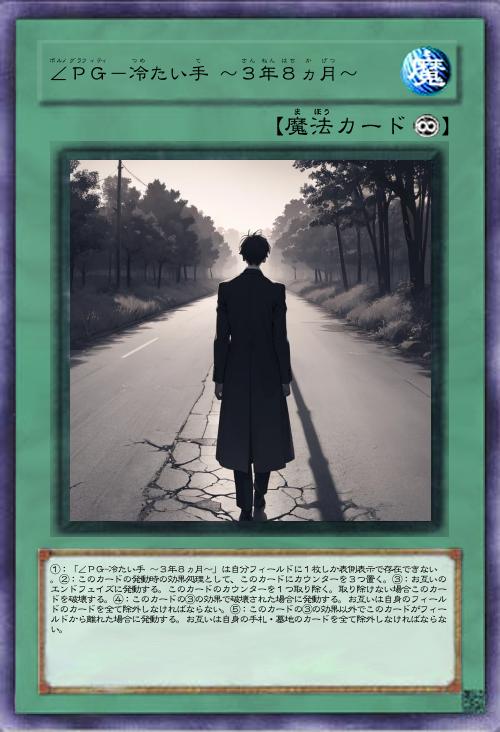 | ①:「∠PG-冷たい手 ~3年8ヵ月~」は自分フィールドに1枚しか表側表示で存在できない。②:このカードの発動時の効果処理として、このカードにカウンターを3つ置く。③:お互いのエンドフェイズに発動する。このカードのカウンターを1つ取り除く。取り除けない場合このカードを破壊する。④:このカードの③の効果で破壊された場合に発動する。お互いは自身のフィールドのカードを全て除外しなければならない。⑤:このカードの③の効果以外でこのカードがフィールドから離れた場合に発動する。お互いは自身の手札・墓地のカードを全て除外しなければならない。 | |||