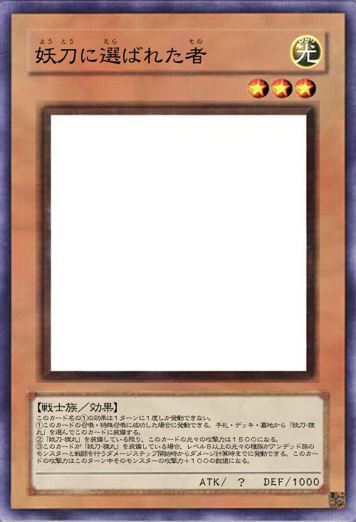 | このカード名の①の効果は1ターンに1度しか発動できない。 ①このカードの召喚・特殊召喚に成功した場合に発動できる。手札・デッキ・墓地から「妖刀-狸丸」を選んでこのカードに装備する。 ②「妖刀-狸丸」を装備している限り、このカードの元々の攻撃力は1500になる。 ③このカードが「妖刀-狸丸」を装備している場合、レベル8以上の元々の種族がアンデッド族のモンスターと戦闘を行うダメージステップ開始時からダメージ計算時までに発動できる。このカードの攻撃力はこのターン中そのモンスターの攻撃力+100の数値になる。 | |||