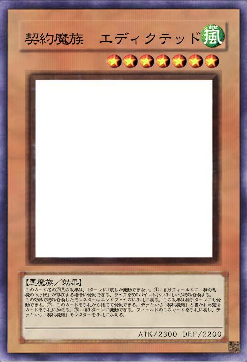 | このカード名の②③の効果は、1ターンに1度しか発動できない。①:自分フィールドに「契約悪魔の依り代」が存在する場合に発動できる、ライフを500ポイント払い手札から特殊召喚する。この効果で特殊召喚したモンスターはエンドフェイズに手札に戻る。この効果は相手ターンにも発動できる。②:このカードを手札から捨てて発動できる。デッキから「契約魔族」と書かれた魔法カードを手札に加える。③:相手ターンに発動できる。フィールドのこのカードを手札に戻し、デッキから「契約魔族」モンスターを手札に加える。 | |||