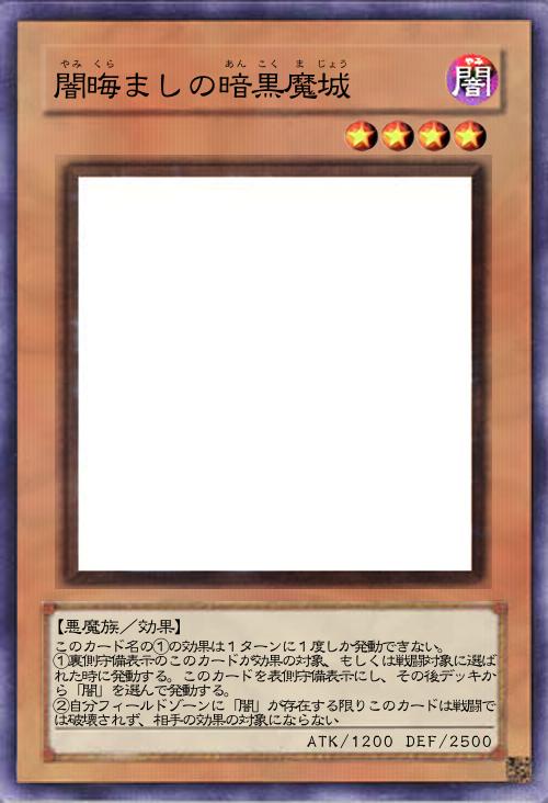 | このカード名の①の効果は1ターンに1度しか発動できない。 ①裏側守備表示のこのカードが効果の対象、もしくは戦闘対象に選ばれた時に発動する。このカードを表側守備表示にし、その後デッキから「闇」を選んで発動する。 ②自分フィールドゾーンに「闇」が存在する限りこのカードは戦闘では破壊されず、相手の効果の対象にならない | |||