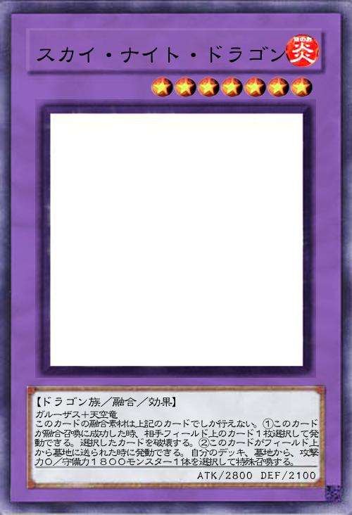 | ガルーザス+天空竜 このカードの融合素材は上記のカードでしか行えない。①このカードが融合召喚に成功した時、相手フィールド上のカード1枚選択して発動できる。選択したカードを破壊する。②このカードがフィールド上から墓地に送られた時に発動できる。自分のデッキ、墓地から、攻撃力0/守備力1800モンスター1体を選択して特殊召喚する。 | |||