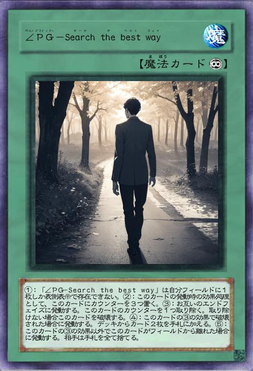 | ①:「∠PG-Search the best way」は自分フィールドに1枚しか表側表示で存在できない。②:このカードの発動時の効果処理として、このカードにカウンターを3つ置く。③:お互いのエンドフェイズに発動する。このカードのカウンターを1つ取り除く。取り除けない場合このカードを破壊する。④:このカードの③の効果で破壊された場合に発動する。デッキからカード2枚を手札に加える。⑤:このカードの③の効果以外でこのカードがフィールドから離れた場合に発動する。相手は手札を全て捨てる。 | |||