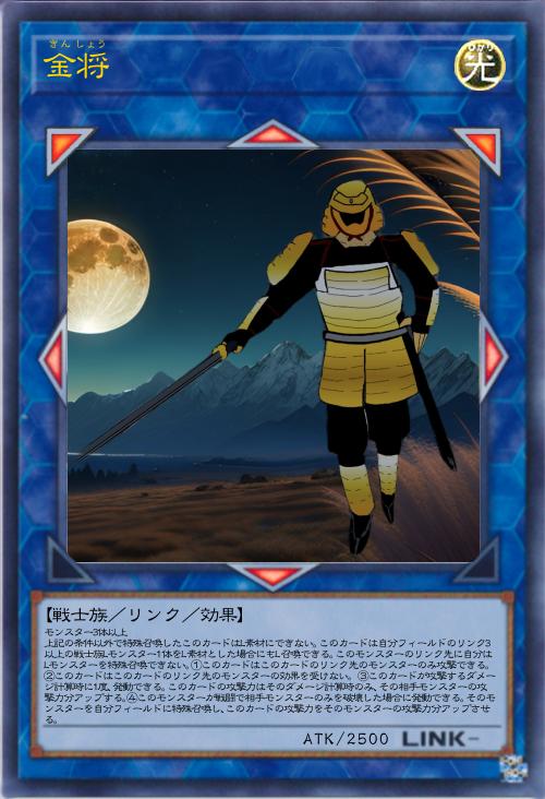 「将棋の金将をモデルにしたカードです。金将と同じように自分から攻撃した場合にはほぼ確実に勝利できるようになっており、取った駒を使えるように破壊したモンスターのコントロールを奪えるようになっています。その効果だけだとちょっと弱いかなと思ったので、攻撃力をアップさせる効果を付与しました。剛鬼あたりから出すのを想定しています。