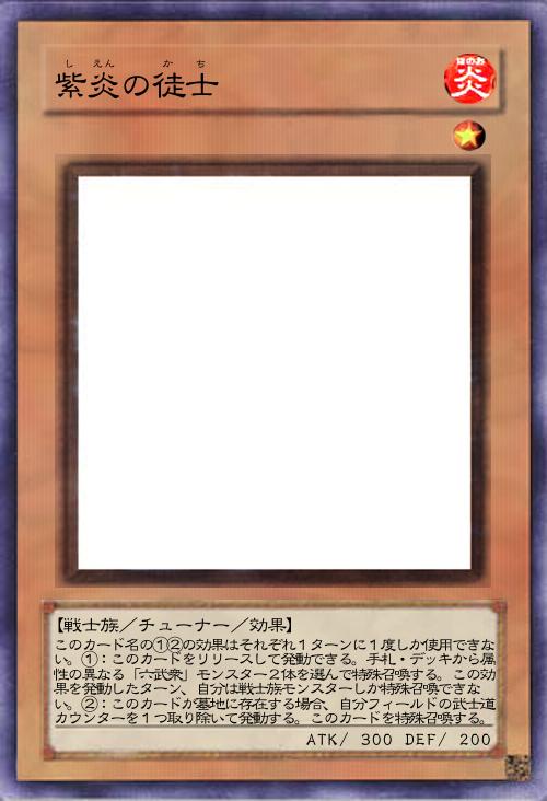 「罪宝ギミックで出して強そうな六武衆新規を作ってみました。どうせ六武衆いろんな属性いるし「紫炎」だし炎属性増やしやすいと思うんです。他の「紫炎」下級モンスター地属性ばっかりなんだけどね。