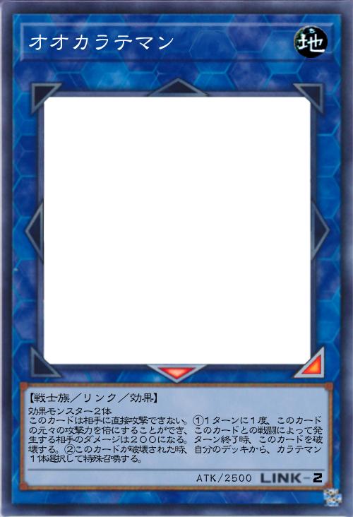 | 効果モンスター2体 このカードは相手に直接攻撃できない。①1ターンに1度、このカードの元々の攻撃力を倍にすることができ、このカードとの戦闘によって発生する相手のダメージは200になる。ターン終了時、このカードを破壊する。②このカードが破壊された時、自分のデッキから、カラテマン1体選択して特殊召喚する。 | |||