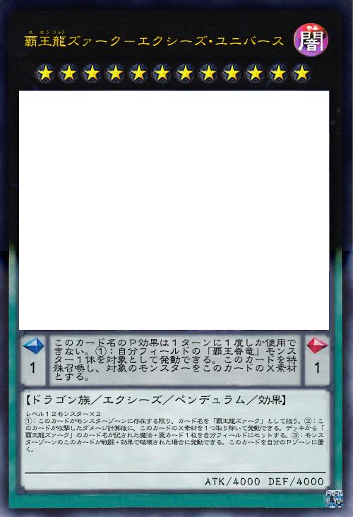 | レベル12モンスター×2 ①:このカードがモンスターゾーンに存在する限り、カード名を「覇王龍ズァーク」として扱う。②:このカードが攻撃したダメージ計算後に、このカードのX素材を1つ取り除いて発動できる。デッキから「覇王龍ズァーク」のカード名が記された魔法・罠カード1枚を自分フィールドにセットする。③:モンスターゾーンのこのカードが戦闘・効果で破壊された場合に発動できる。このカードを自分のPゾーンに置く。 | |||