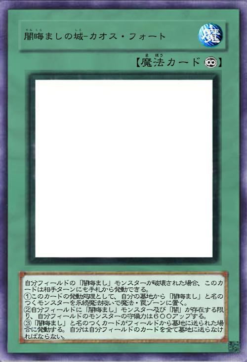 「闇のPKリメイク(多分)最後の1枚。カオス・シールドと闇晦ましの城を合わせた。原作さながらの圧倒的防御性能を誇るものの、闇晦ましの城が破壊されたら大惨事。