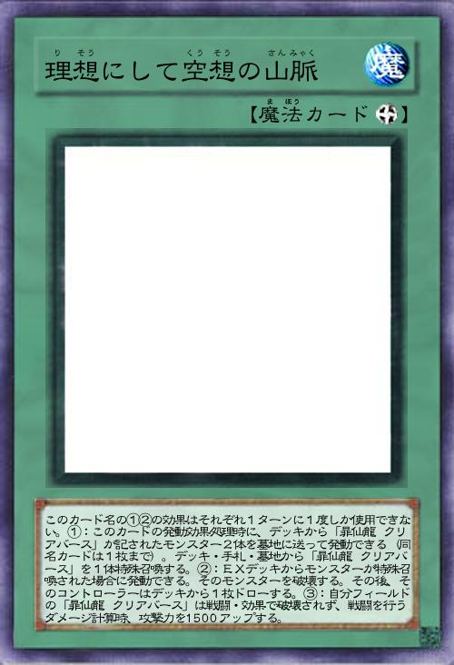 | このカード名の①②の効果はそれぞれ1ターンに1度しか使用できない。①:このカードの発動効果処理時に、デッキから「暃仙龍 クリアバース」が記されたモンスター2体を墓地に送って発動できる(同名カードは1枚まで)。デッキ・手札・墓地から「暃仙龍 クリアバース」を1体特殊召喚する。②:EXデッキからモンスターが特殊召喚された場合に発動できる。そのモンスターを破壊する。その後、そのコントローラーはデッキから1枚ドローする。③:自分フィールドの「暃仙龍 クリアバース」は戦闘・効果で破壊されず、戦闘を行うダメージ計算時、攻撃力を1500アップする。 | |||