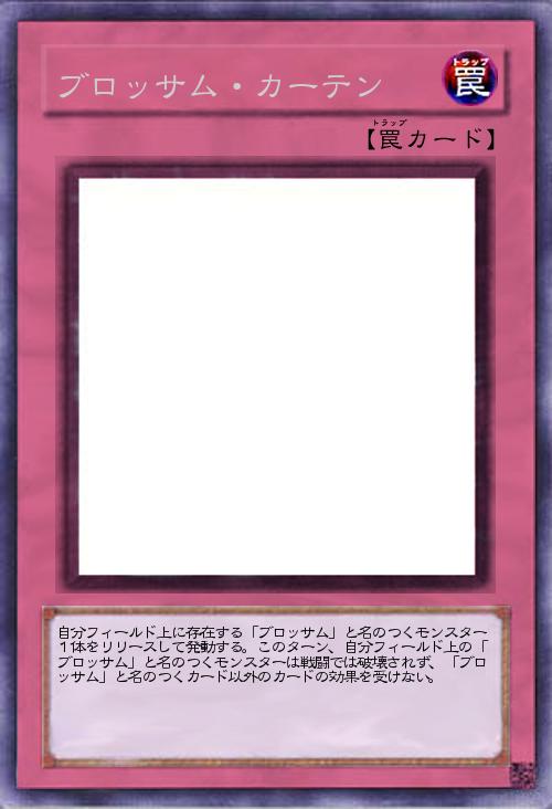 | 自分フィールド上に存在する「ブロッサム」と名のつくモンスター1体をリリースして発動する。このターン、自分フィールド上の「ブロッサム」と名のつくモンスターは戦闘では破壊されず、「ブロッサム」と名のつくカード以外のカードの効果を受けない。 | |||