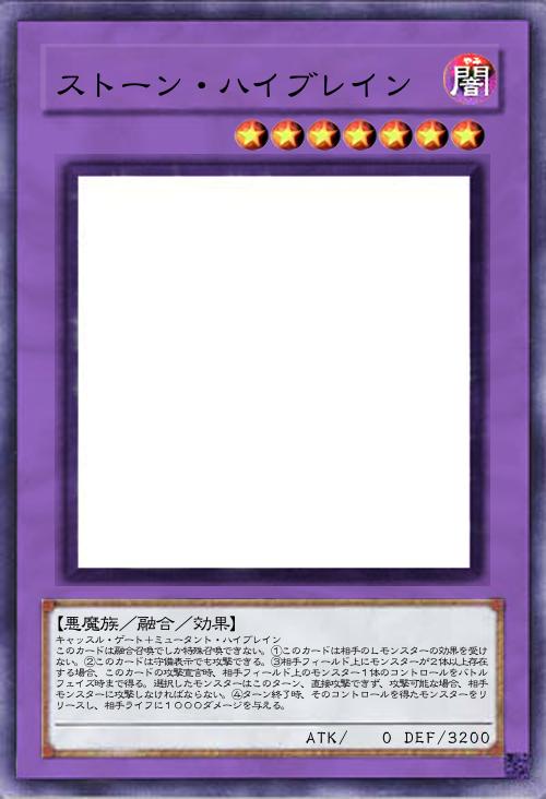 | キャッスル・ゲート+ミュータント・ハイブレイン このカードは融合召喚でしか特殊召喚できない。①このカードは相手のLモンスターの効果を受けない。②このカードは守備表示でも攻撃できる。③相手フィールド上にモンスターが2体以上存在する場合、このカードの攻撃宣言時、相手フィールド上のモンスター1体のコントロールをバトルフェイズ時まで得る。選択したモンスターはこのターン、直接攻撃できず、攻撃可能な場合、相手モンスターに攻撃しなければならない。④ターン終了時、そのコントロールを得たモンスターをリリースし、相手ライフに1000ダメージを与える。 | |||
