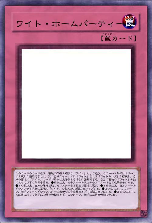 | このカードのカード名は、墓地に存在する限り「ワイト」として扱う。このカード効果は1ターンに1度しか使用できない。①:自分フィールドに「ワイト」または「ワイトキング」が存在し、自分の墓地に「ワイト」カードが5枚以上存在する場合に発動できる。自分の墓地の「ワイト」の数によって以下の効果を得る。●5枚以上:相手フィールド上のモンスターは全て攻撃表示になる。●10枚以上:自分の除外状態のモンスターを3枚まで墓地に戻す。●15枚以上:自分フィールドのアンデッド族は墓地の「ワイト」の数×200攻撃力をアップする。●20枚以上:このターン、相手フィールドのモンスターは表示形式を変更できず、攻撃力を0にする。●25枚以上:この効果に対して相手は効果を発動できず、このターン、相手は効果を発動できない。 | |||