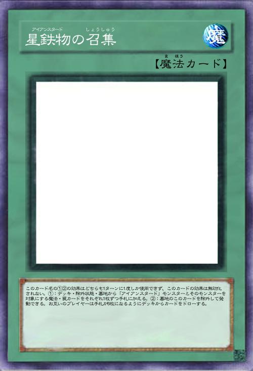 | このカード名の①②の効果はどちらも1ターンに1度しか使用できず、このカードの効果は無効化されない。①:デッキ・除外状態・墓地から「アイアンスタード」モンスターとそのモンスターを対象にする魔法・罠カードをそれぞれ1枚ずつ手札に加える。②:墓地のこのカードを除外して発動できる。お互いのプレイヤーは手札が6枚になるようにデッキからカードをドローする。 | |||