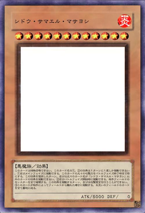 | このカードは特殊召喚できない。このカード名の①、②の効果は1ターンに1度しか発動できない。①自分メインフェイズに発動できる。このカードの元々の攻撃力をバトルフェイズ終了時まで倍にする。この効果を使用したターン、自分は元々のカード名が「シドウ・サマエル・マサヨシ」以外のカードの効果を発動できない。②自分バトルフェイズ開始時に発動できる。相手フィールドのモンスターを全て破壊する。この効果を発動するターン、自分は攻撃宣言を行うことができない。③このカードが相手によってフィールドから離れた場合に発動する。お互いのフィールドのカードを全て墓地に送る。 | |||