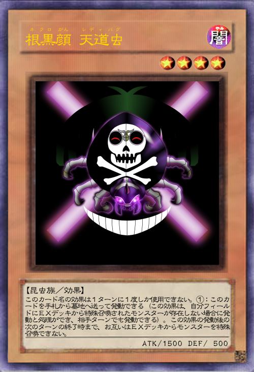 コストも死に関連して(手札から)墓地へ送って発動可能なものにしていて、攻守は髑髏顔 天道虫と差別化するために逆にしました。