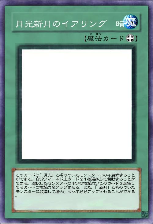 | このカードは「月光」と名のついたモンスターにのみ装備することができる。自分フィールド上カードを1枚選択して発動することができる。選択したモンスターの半分の攻撃力分このカードを装備してるカードの攻撃力をアップさせる。また、「新月」と名のついたモンスターに装備して場合、もう半分分アップさせることができる。 | |||