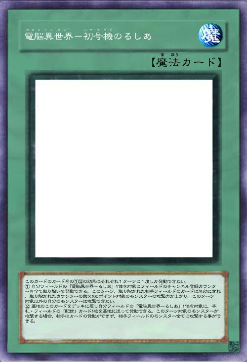 | このカードのカード名の①②の効果はそれぞれ1ターンに1度しか発動できない。 ①∶自分フィールドの「電脳異世界-るしあ」1体を対象にフィールドのチャンネル登録カウンターを全て取り除いて発動できる。このターン、取り除かれた相手フィールドのカードは無効にされ、取り除かれたカウンターの数×100ポイント対象のモンスターの攻撃力が上がり、このターン対象以外の自分のモンスターは攻撃できない。 ②∶墓地のこのカードをデッキに戻し自分フィールドの「電脳異世界-るしあ」1体を対象に、手札・フィールドの「配信」カード1枚を墓地に送って発動できる。このターン対象のモンスターが攻撃する場合、相手はカードの発動ができず、相手フィールドのモンスター全てに攻撃する事ができる。 | |||